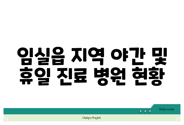 임실군은 넓은 지역이지만, 임실읍을 중심으로 주변 지역 주민들의 의료 수요를 감당해야 하기 때문에 야간 및 휴일 진료가 가능한 병원의 중요성이 더욱 커요. 하지만 안타깝게도 모든 병원이 야간진료나 휴일진료를 제공하는 것은 아니랍니다. 따라서, 꼭! 아래 정보를 확인하시고, 필요한 경우 미리 전화로 진료 가능 여부를 확인하는 것이 좋습니다.